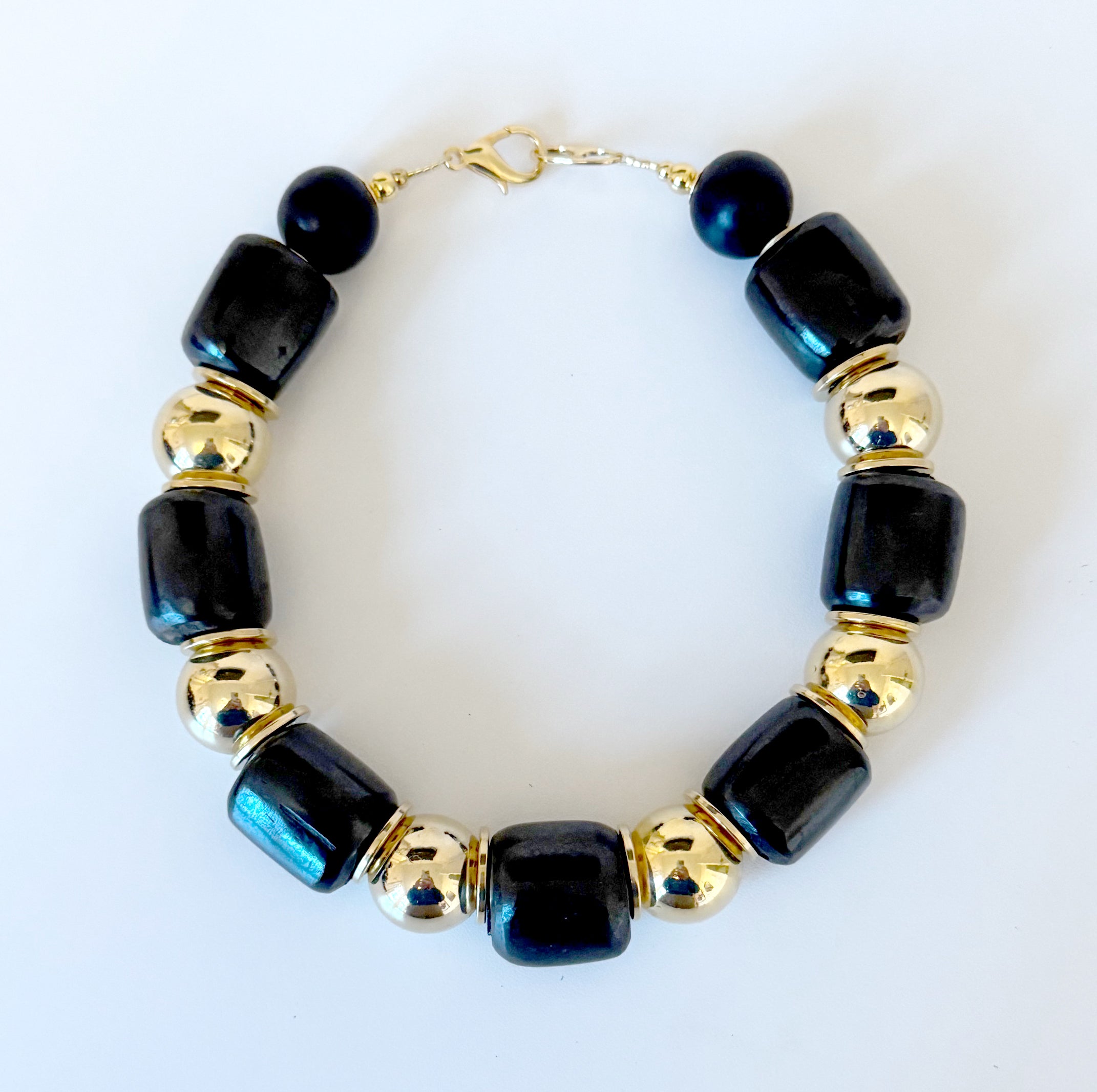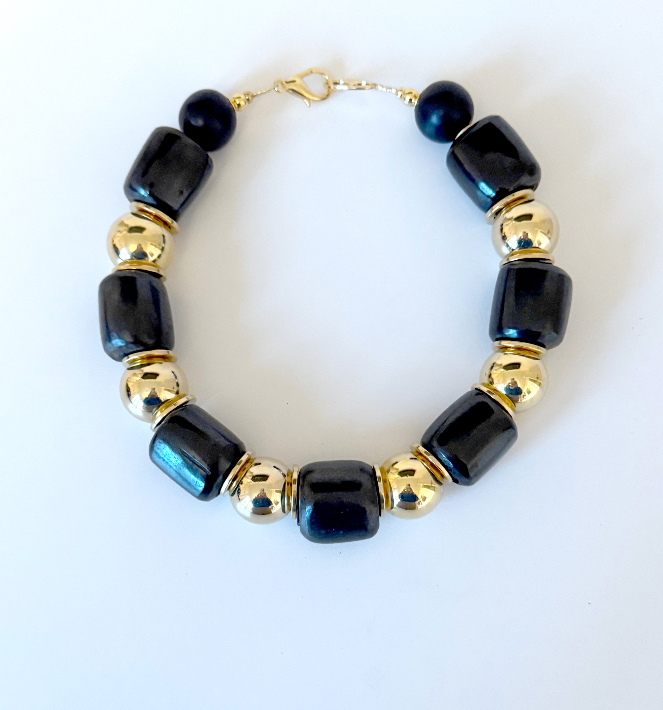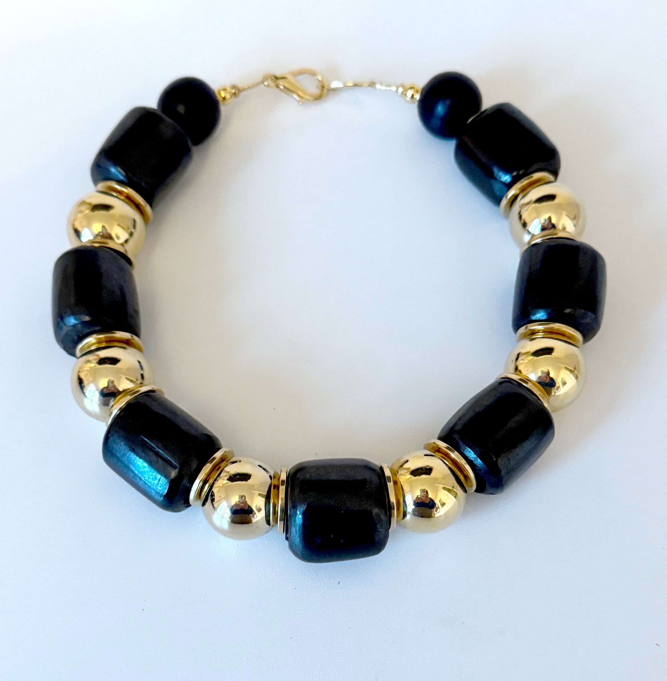 This necklace is part of the Asante collection. This black and gold necklace is stunning.  Each piece in this collection has it's own unique design. Made with large black barrel bone beads, brass balls and thin brass discs in between. Truly a timeless and beautiful piece.