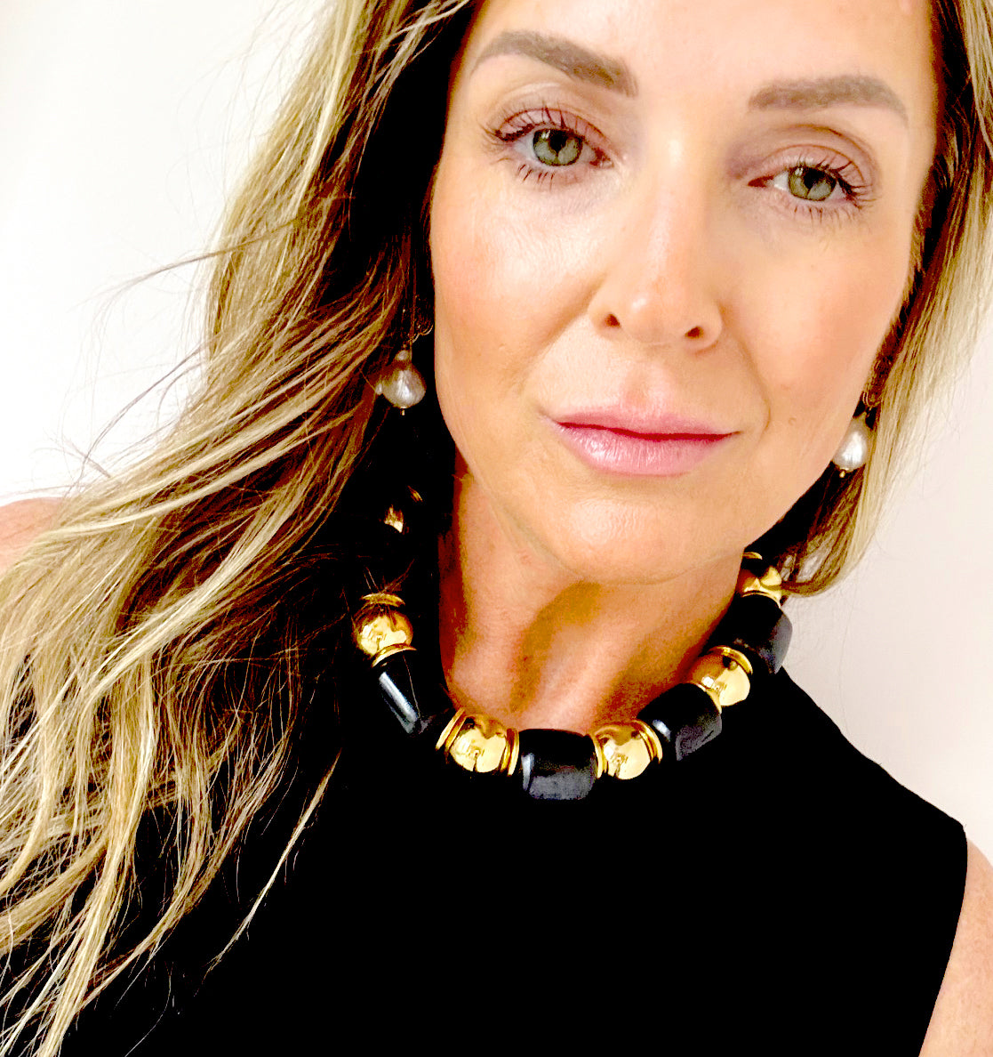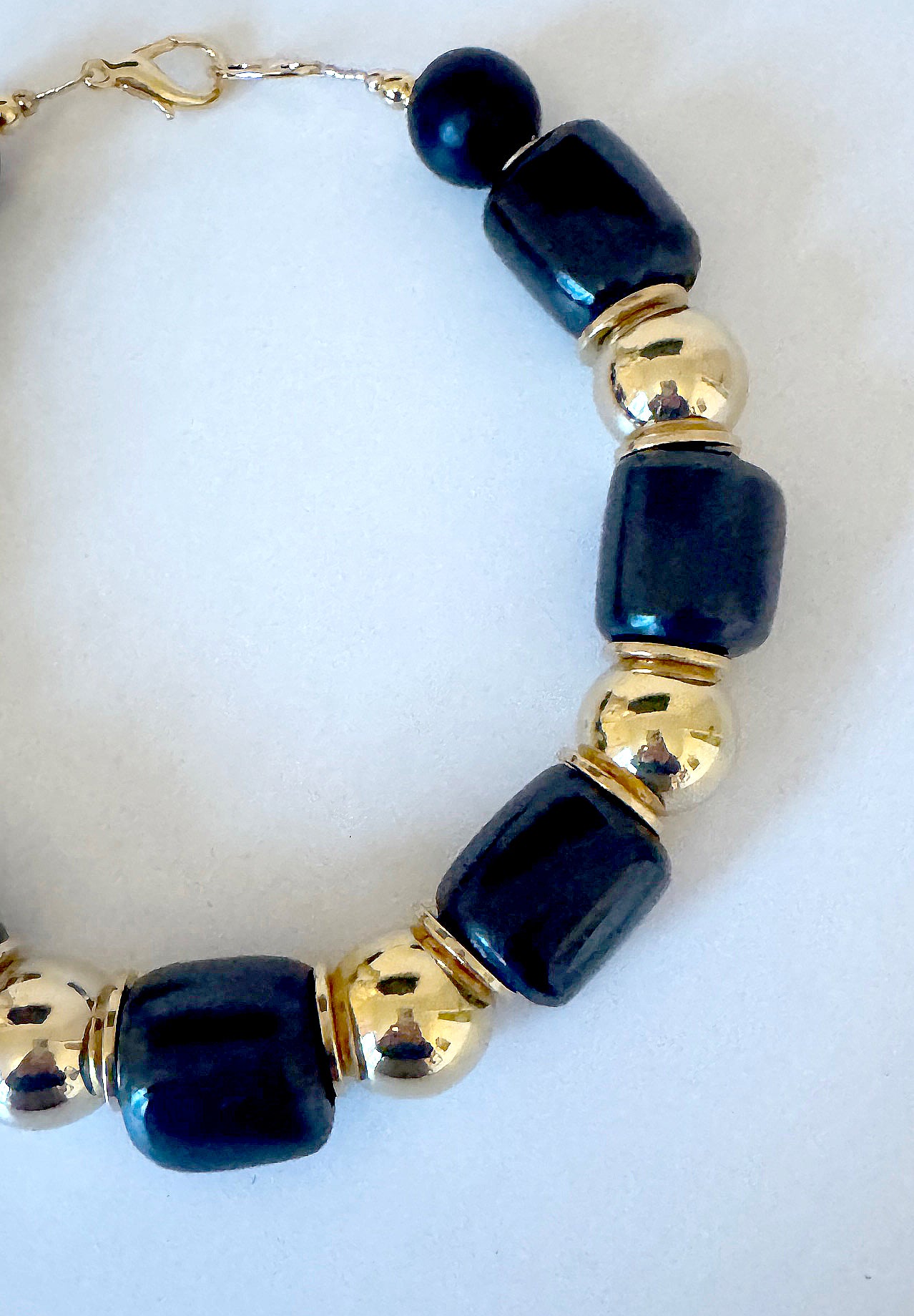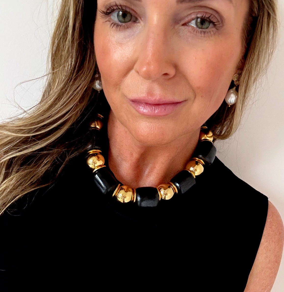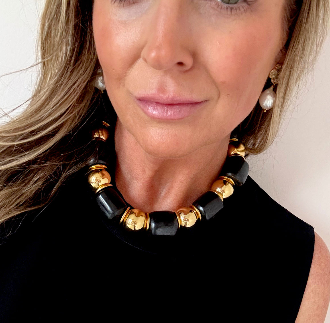 This necklace is part of the Asante collection. This black and gold necklace is stunning.  Each piece in this collection has it's own unique design. Made with large black barrel bone beads, brass balls and thin brass discs in between. Truly a timeless and beautiful piece.
