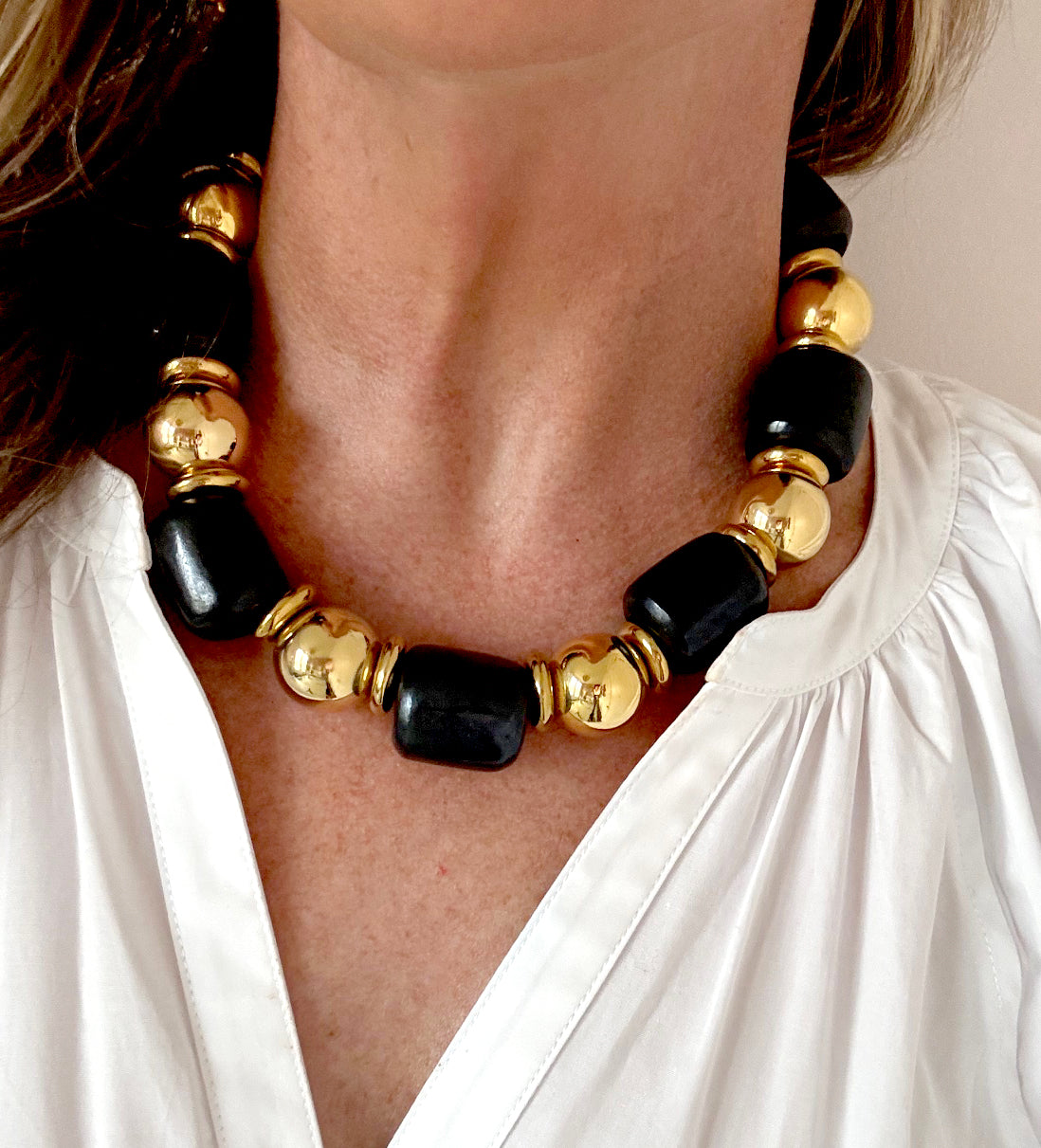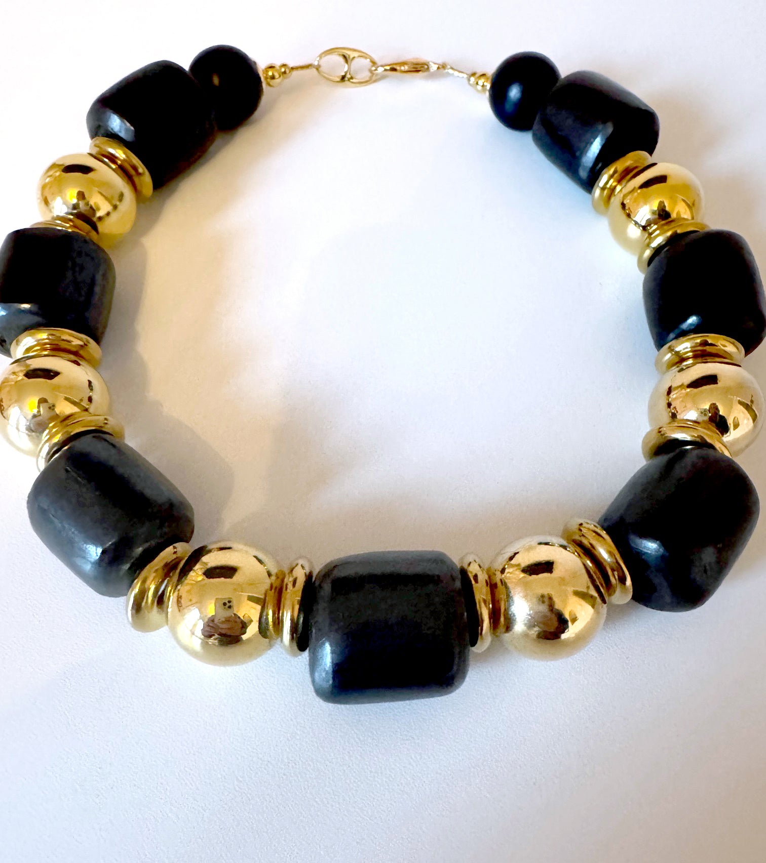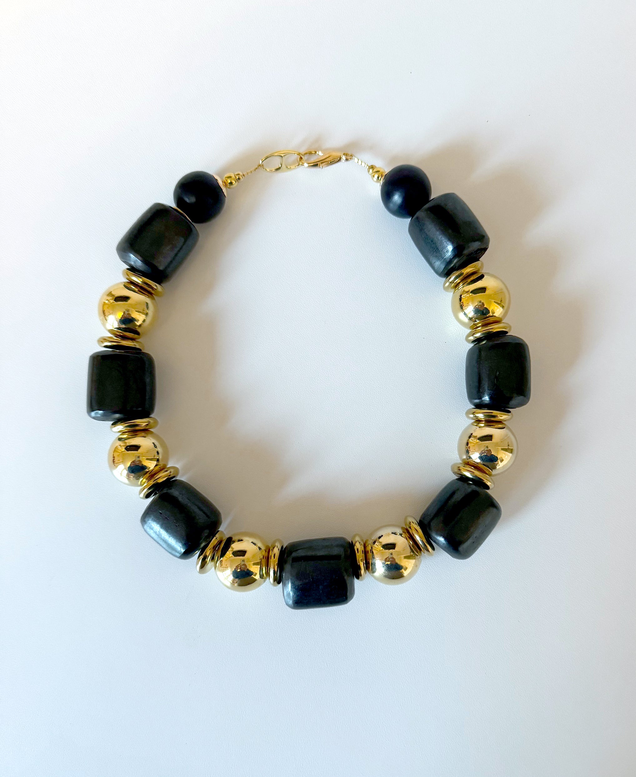 This necklace is part of the Asante collection. This black and gold necklace is absolutely stunning.  Each piece in this collection has it's own unique design.  Made with large black barrel bone beads, brass balls and thick brass discs in between. Truly a timeless and beautiful piece.