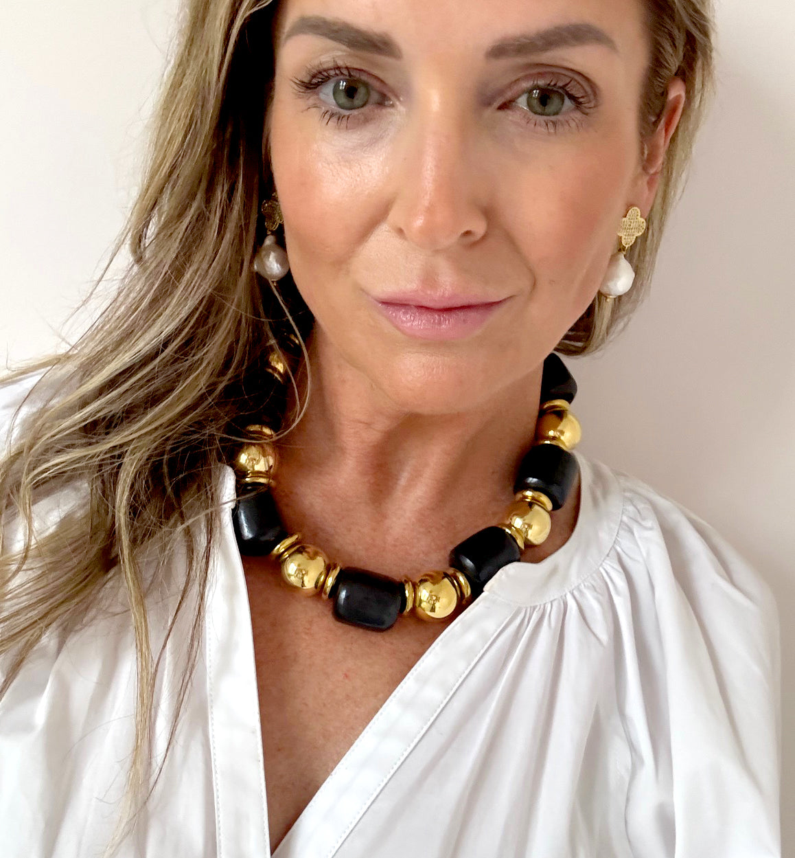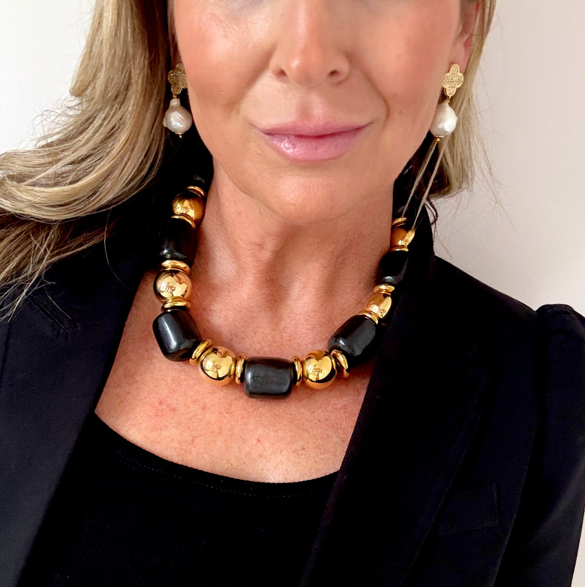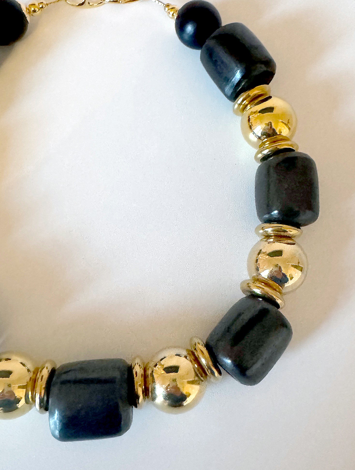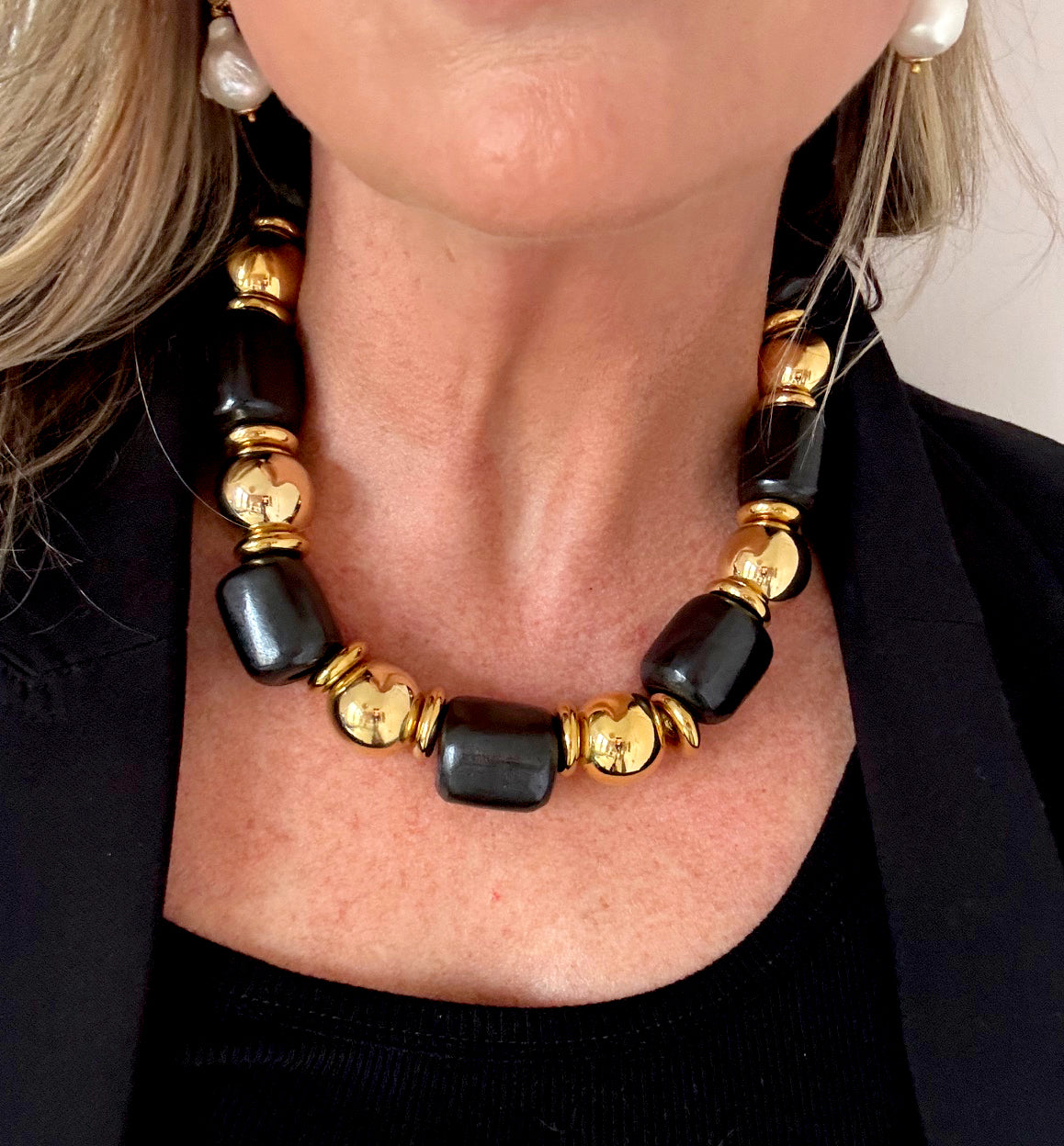 This necklace is part of the Asante collection. This black and gold necklace is absolutely stunning.  Each piece in this collection has it's own unique design.  Made with large black barrel bone beads, brass balls and thick brass discs in between. Truly a timeless and beautiful piece.