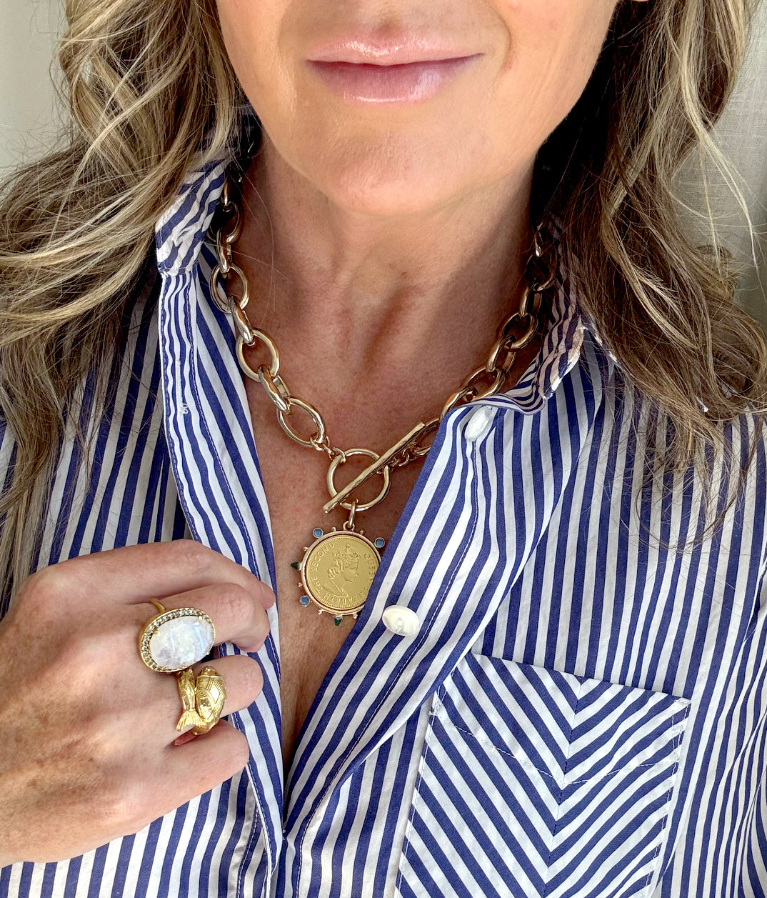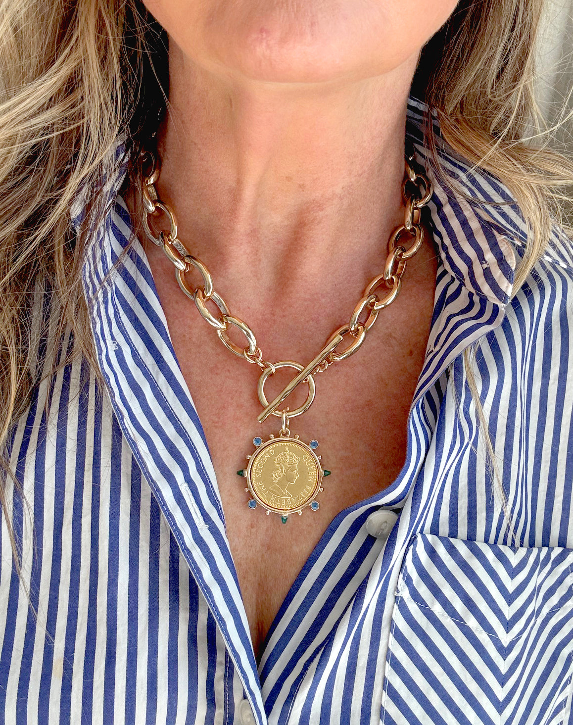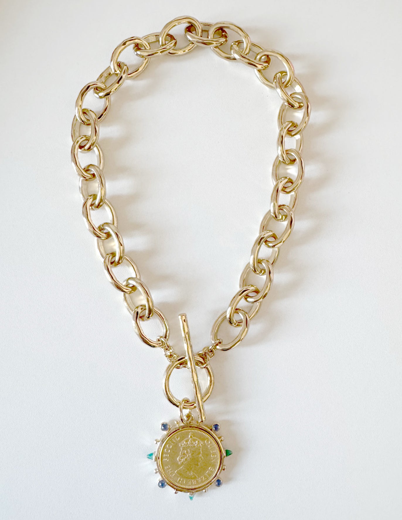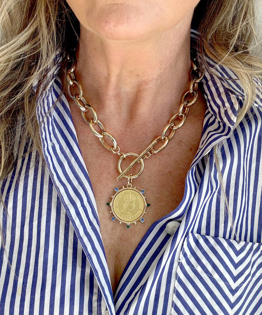 This beautiful Queen Elizabeth II reproduction coin necklace, is made with a chunky gold plated cable chain with a T-bar clasp worn in front. The bezel size is 40mm, chain length 18".