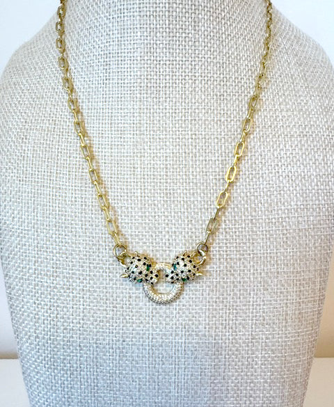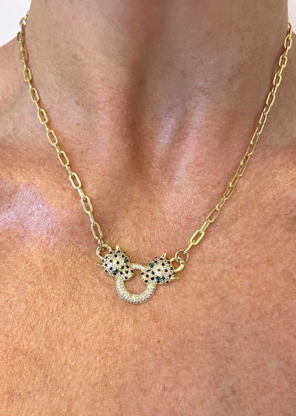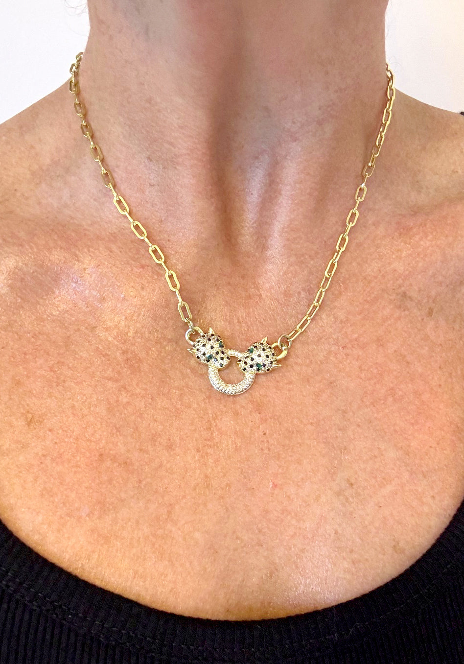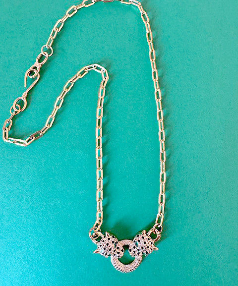 This rhinestone gold plated Panther pendant, is on beautiful gold filled dainty paperclip chain. A fun and unique piece. Finished with a hook and eye clasp.