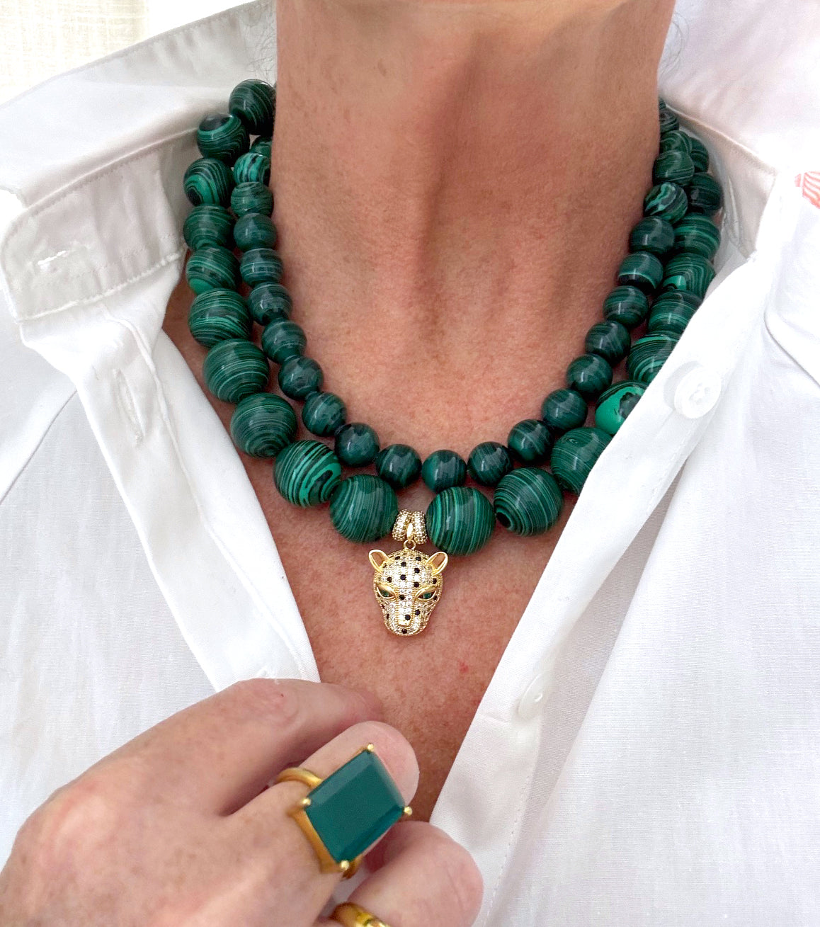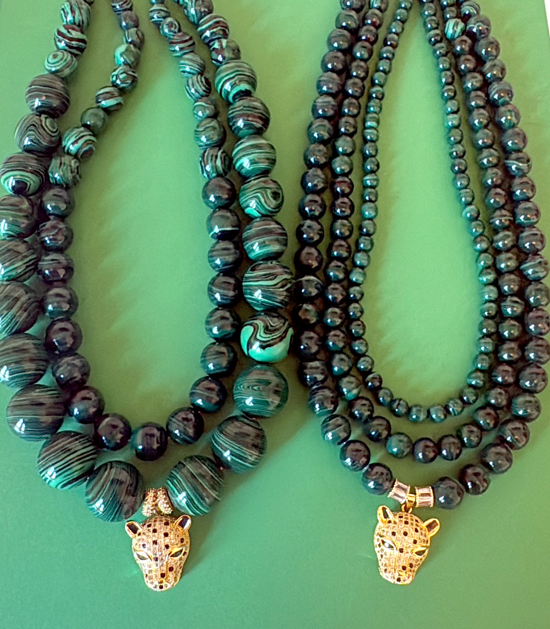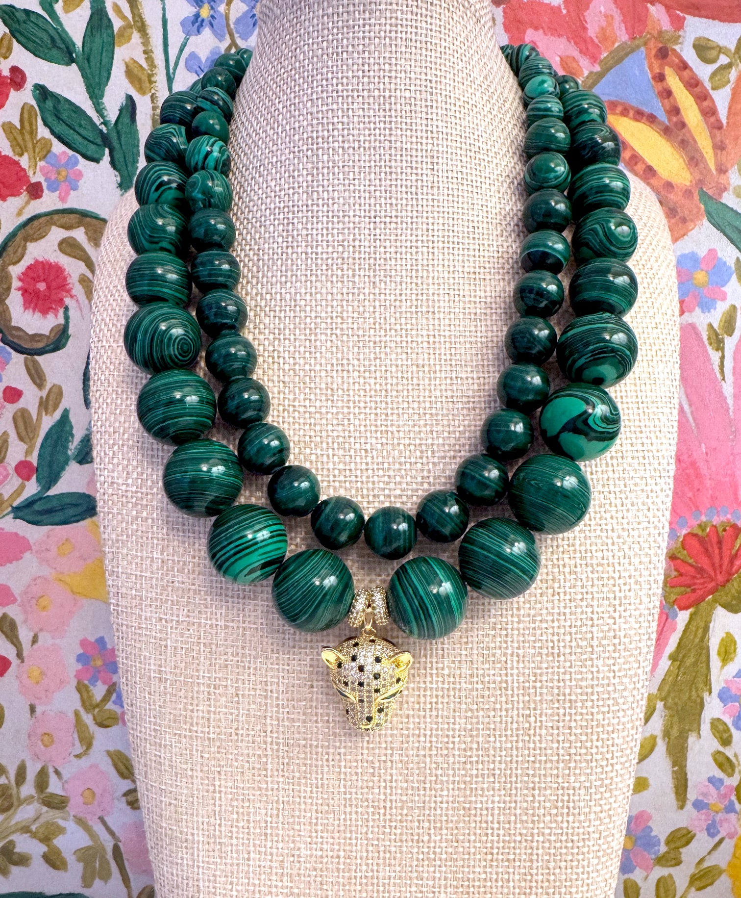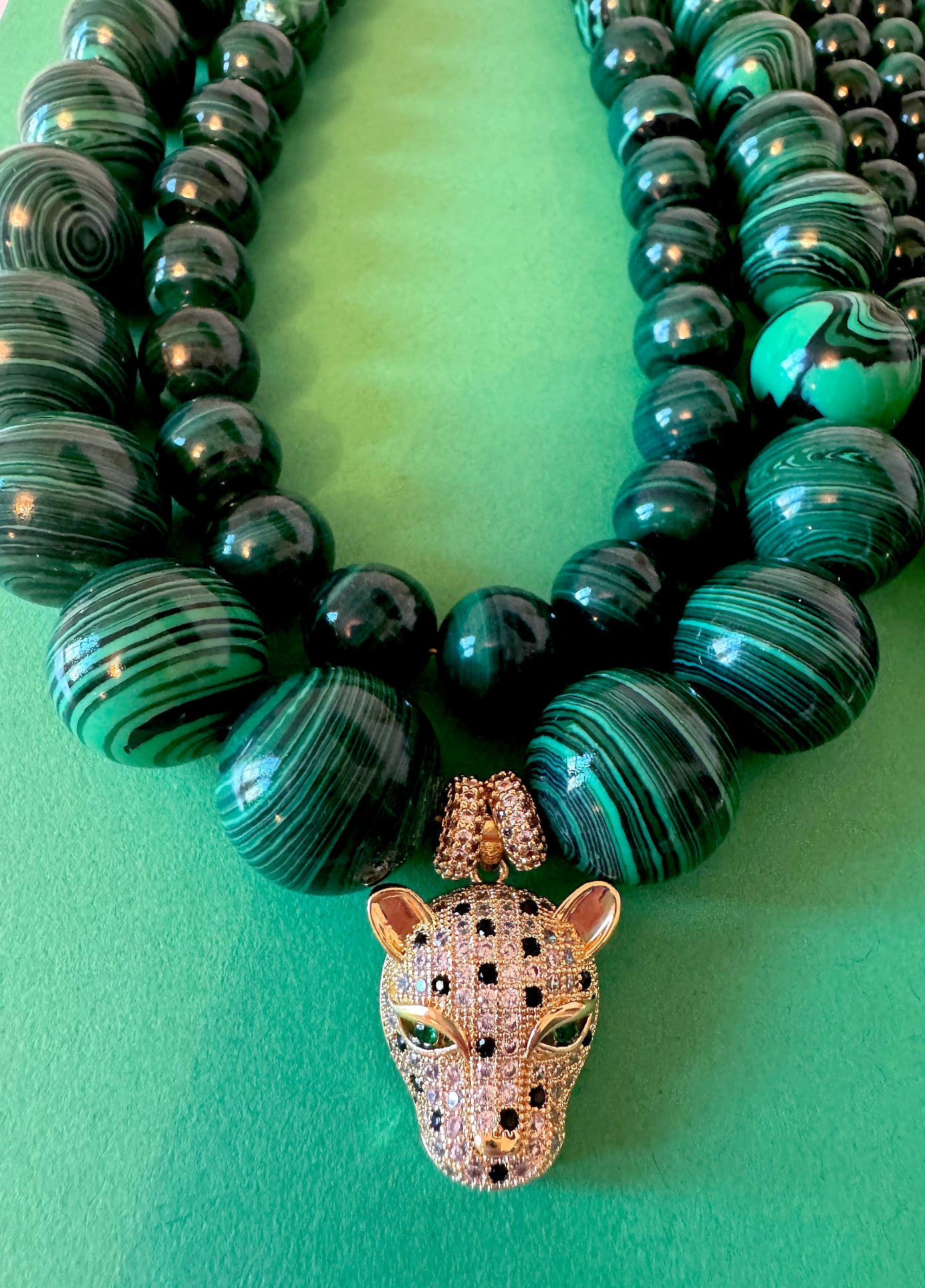 This Panther & Malachite necklace is stunning and unique. It is made with beautiful AAA grade Malachite beads in 2 sizes with two small pave baguettes flanking a white & green rhinestone Panther. It's finished with a gold plated and pave encrusted lobster clasp.